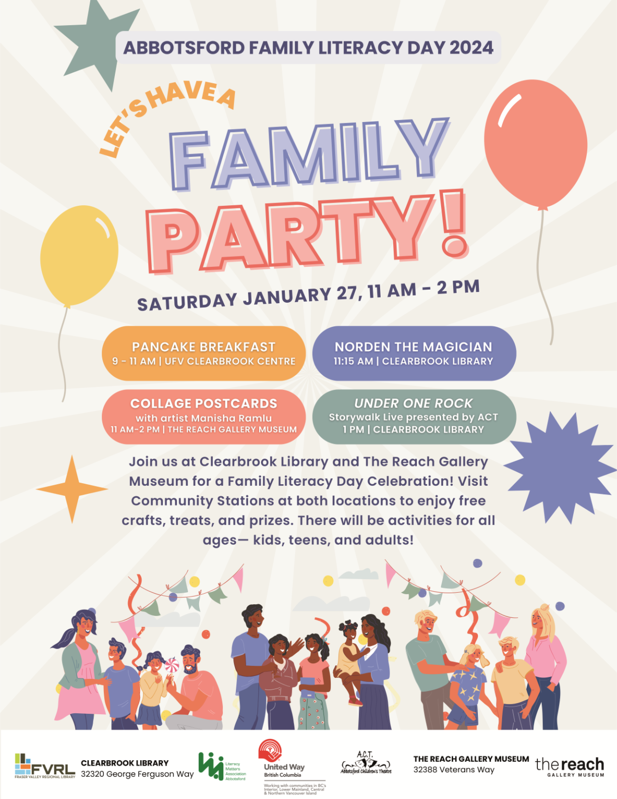 We are inviting you to take part in Abbotsford Family Literacy Day at Clearbrook Library and The Reach Gallery Museum by visiting Community Literacy Stations at both locations to enjoy free crafts, treats and prizes. There will be activities for all ages—kids, teens and adults!