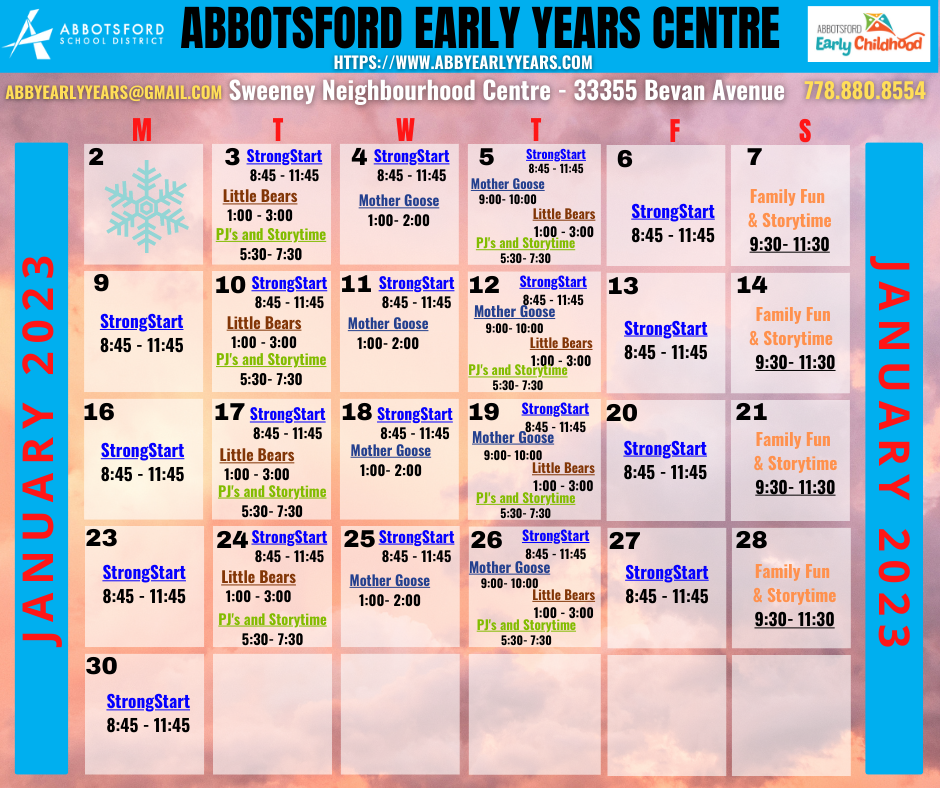 Below is the January Calendar with all the programs and drop-in events at the Sweeney Neighbourhood Centre. For other FREE programs, drop-ins and events throughout Abbotsford please visit our website at: https://www.abbyearlyyears.com/events