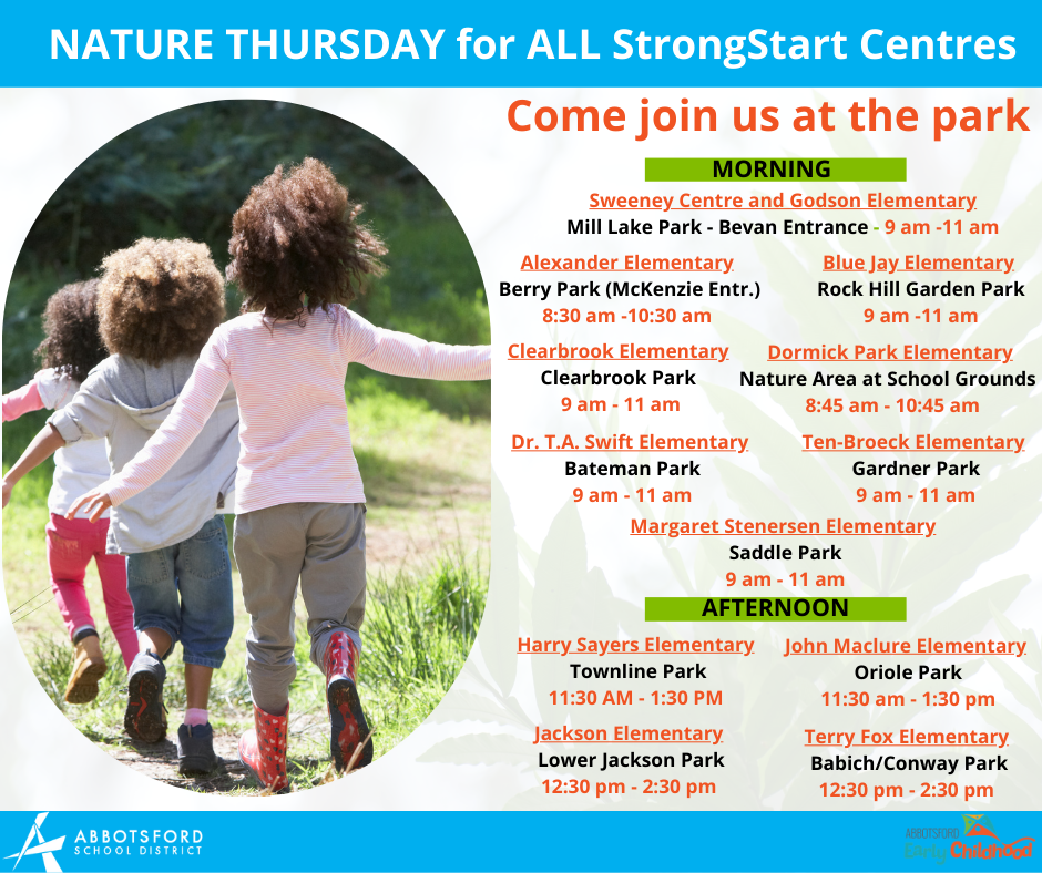 Nature Thursday is Back!!! Put on your boots and puddle pants and let’s go outside to have fun!! Nature Thursday is an outdoor day for ALL StrongStart Centres. Rain or Shine the facilitator will wait (20 min - please try to be on time) for your arrival at the designated park. Please check the flyer below or click HERE for times and locations.