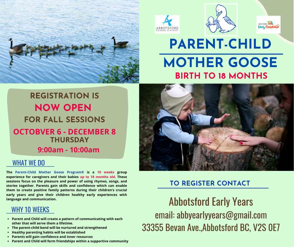 Hello Abbotsford!! Registration is now open for our Parent-Child Mother Goose Program at the Sweeney Neighbourhood Centre. ***Please Note*** There are two sessions to choose from: Wednesday Afternoons or Thursday Mornings. Please check the flyers for more information.