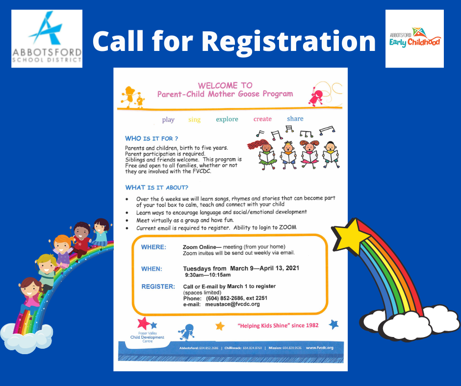Our Friends from Fraser Valley Child Development Centre have a NEW 6 weeks Online Parent-Child Mother Goose Program for you! Spaces are limited! Make sure you register early.