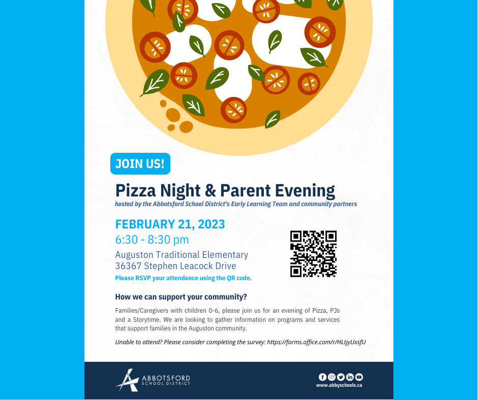 This event is hosted by the Abbotsford School District's Early Learning Team and community partners. How can we support your community? Families/Caregivers with children 0-6, if you live in the Auguston area please join us for an evening of Pizza, PJs and a Storytime. We are looking to gather information on programs and services that support families in the Auguston community. If you would like to join us please register using the QR code. If you are unable to attend but would still like to give your feedback, please complete the survey using the link below. https://forms.office.com/r/HLtjyUxsfU